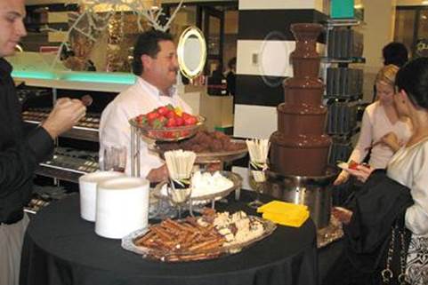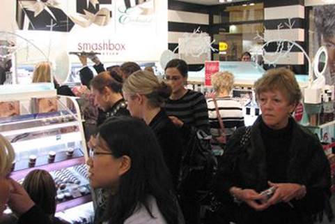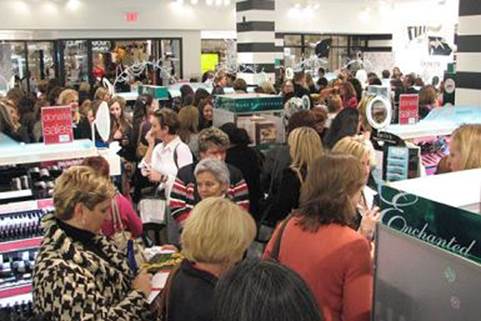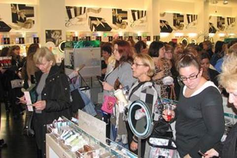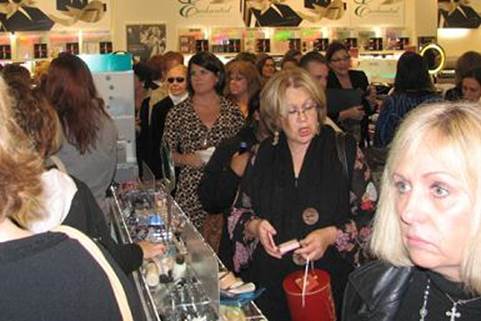 As for the party, it could best be compared to an adult slumber party. They had food and drinks, dance music and free makeovers. The women (there were only about a half-dozen men milling about, most holding an armful of coats and bags and craning their necks looking for their wives/girlfriends) chatted and shopping, sampled more than 15,000 beauty products and lined up 50+-deep to purchase, in some cases, hundreds of dollars worth of product.